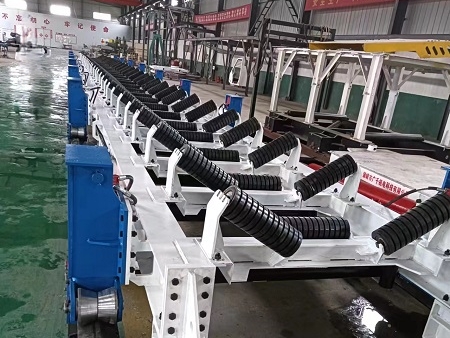 将支撑缸活塞杆推出,抬起转载机落地段;转载机在推移油缸和支架推移缸的作用下,以地面为支点,利用导轨和地面的摩擦力,使转载机沿着导轨前进一个行程。然后将支撑杆活塞杆收缩,转载机落回地面,同时导向轮架将导轨抬离地面,然后操作控制台使推移缸活塞杆收缩,导轨前进一个行程,这样往复循环,从而实现迈步自移。